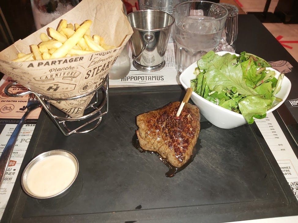 N'en pouvant plus les pieds en compotes, j'allais prendre une bouche de métro quand j'ai aperçu enfin un endroit pour manger = un Hippo, où j'ai mangé comme un roi – bœuf mariné- menu 20€ dont légumes à volonté que j'ai repris 3 fois frites+ salade =