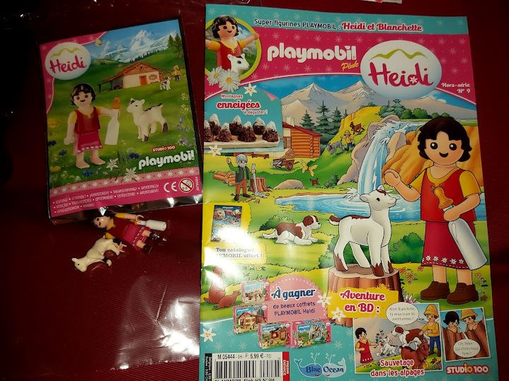 Après hésitation ridicule de quelques semaines, j'ai finalement pris le magazine PLAYMOBIL avec la petite figurine de Heidi et sa chèvre! Dès que j'aurais déménagé et serais installé de façon plus tranquille, je jure de commander le chalet HEIDI qui est magique qui est vraiment la copie de celui de la série!