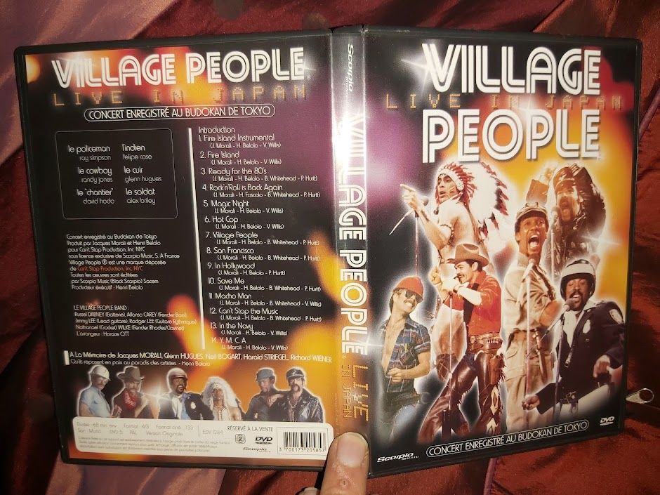+ 1 DVD VILLAGE PEOPLE en concert 1997 = je suis fan, j’achète des vinyles dans les brocantes inutile de vous dire de quels membres j’étais fan enfant mais j’ai été très déçu par ce concert : pendant 1H que des chansons inconnus affreuses, il faut attendre 45mn et approche de la fin du concert pour avoir enfin des tubes….