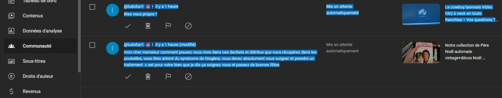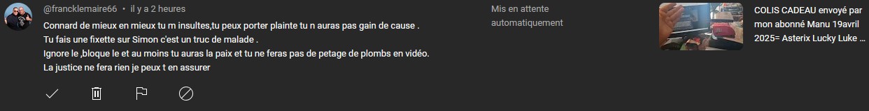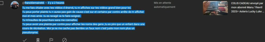 il a créé 2 vidéos sur moi dont une avec FANTOMAS qui rigole il marque mon vrai nom de famille ! Ce qui est illégal je rappelle que j’ai porté plainte contre lui !!