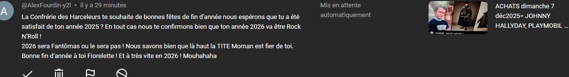 Le harceleur de retour en tentative de com, nouveau (801éme) compte YouTube créé hier soir que j’ai immédiatement banni de ma chaine = Menaces de me faire vivre une année 2026 d’enfer, seulement 24H après la réouverture des coms alors que demain ce sont les 3ans de la mort de ma mère !! Ce petit con est une pourriture !!