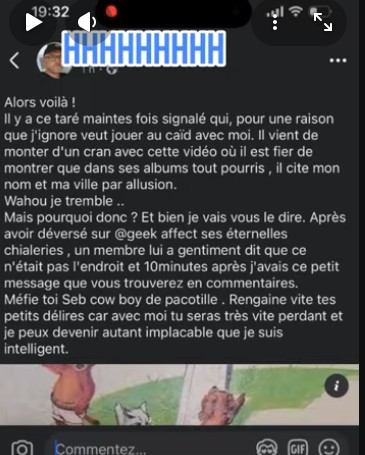 >>> Cet autre Sebastien qui me menace publiquement et lave son linge sale sur la place publique des réseaux ne parlait pas comme ça avant sa publication hier. Il me disait être ravi et fan de ma chaine quand il avait vu ma vidéo de 1H sur son bouquin PIF GADGET que j’avais acheté et présenté sur ma chaine il y a 1an !