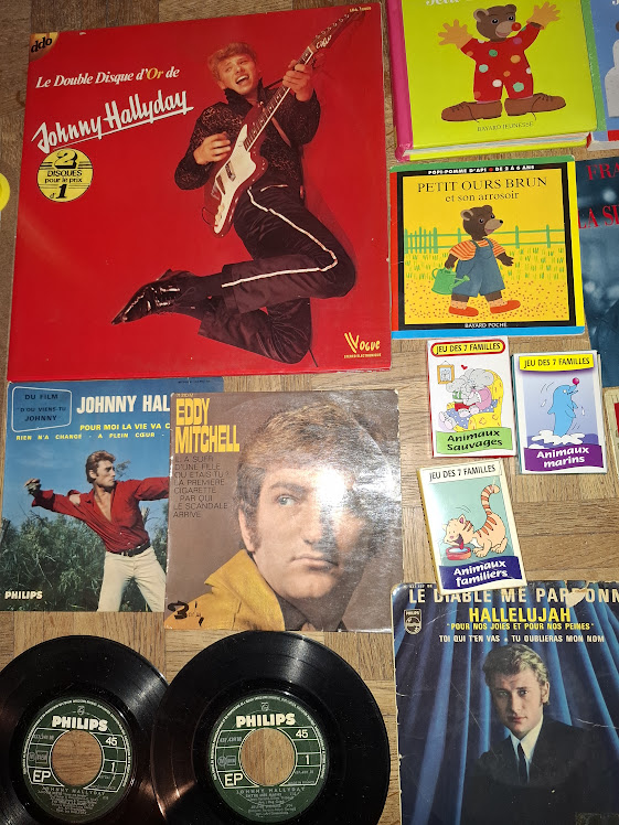 Le double 33t JOHNNY 1961 tout neuf photos avec son fameux pantalon en cuir pour 1euro c’est super même si ce sont les chansons des débuts les moins intéressantes mais pour un 45t JOHNNY que je n’avais pas 2 vinyles dedans de lui et aucun ne correspondant au disque !