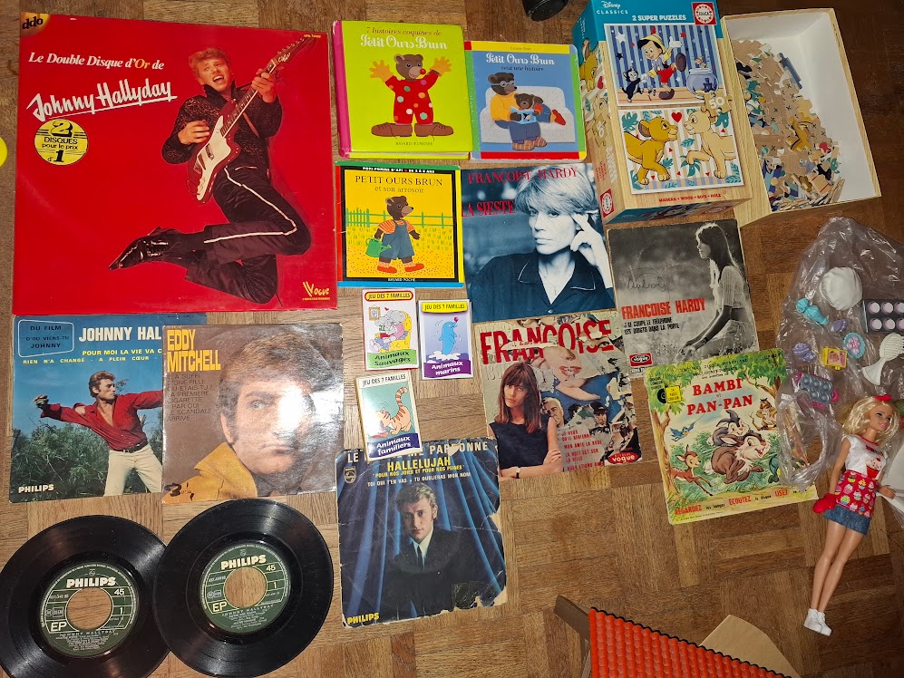 Le double 33t JOHNNY 1961 tout neuf photos avec son fameux pantalon en cuir pour 1euro c’est super même si ce sont les chansons des débuts les moins intéressantes mais pour un 45t JOHNNY que je n’avais pas 2 vinyles dedans de lui et aucun ne correspondant au disque !