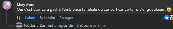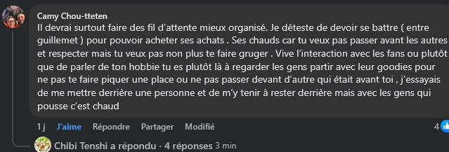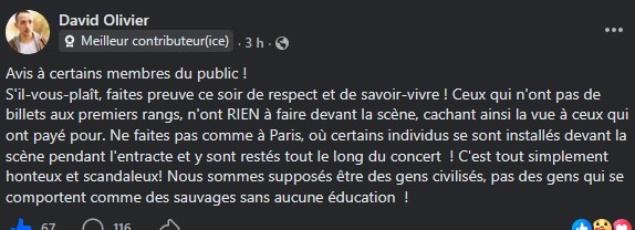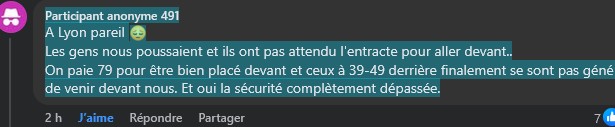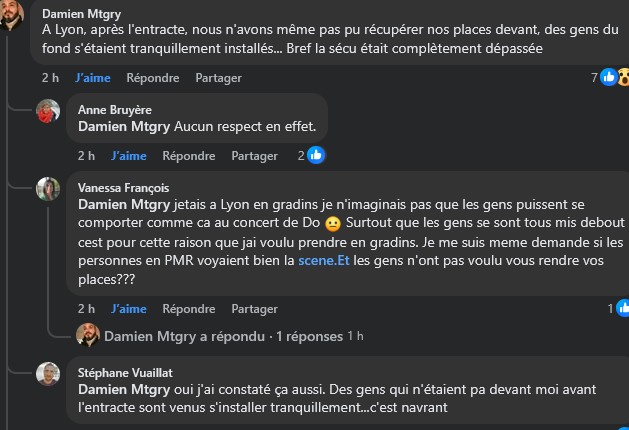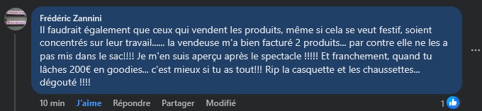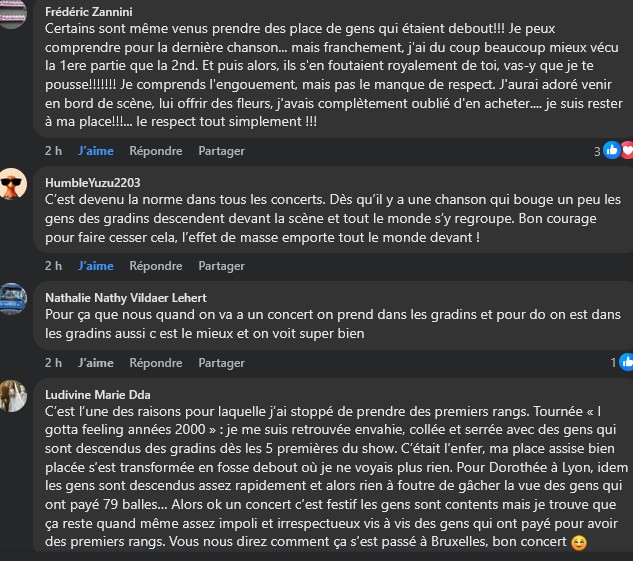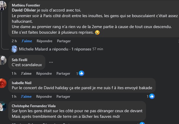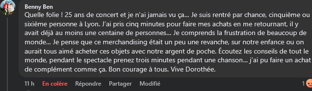Je n’ai fait que quelques captures sur les groupes FB DOROTHÉE de ces centaines de fanatiques des débordements, bagarres dans la salle où certains n’ont rien pu voir pourtant dans le carré OR et le bordel au SEUL stand de merchandising géré par des incompétents +JLA n’a pas mis les pieds dans aucun concert actuellement en froid avec Dorothée qui a voulu changer d’équipe pour cette MINI tournée !